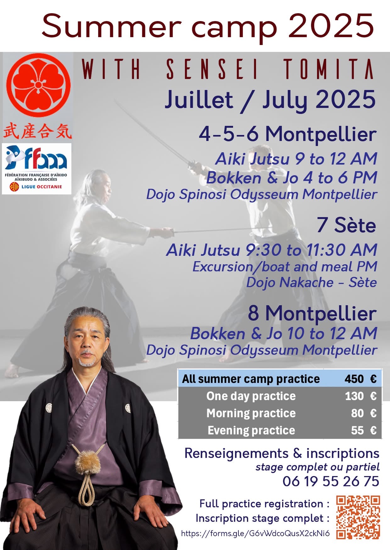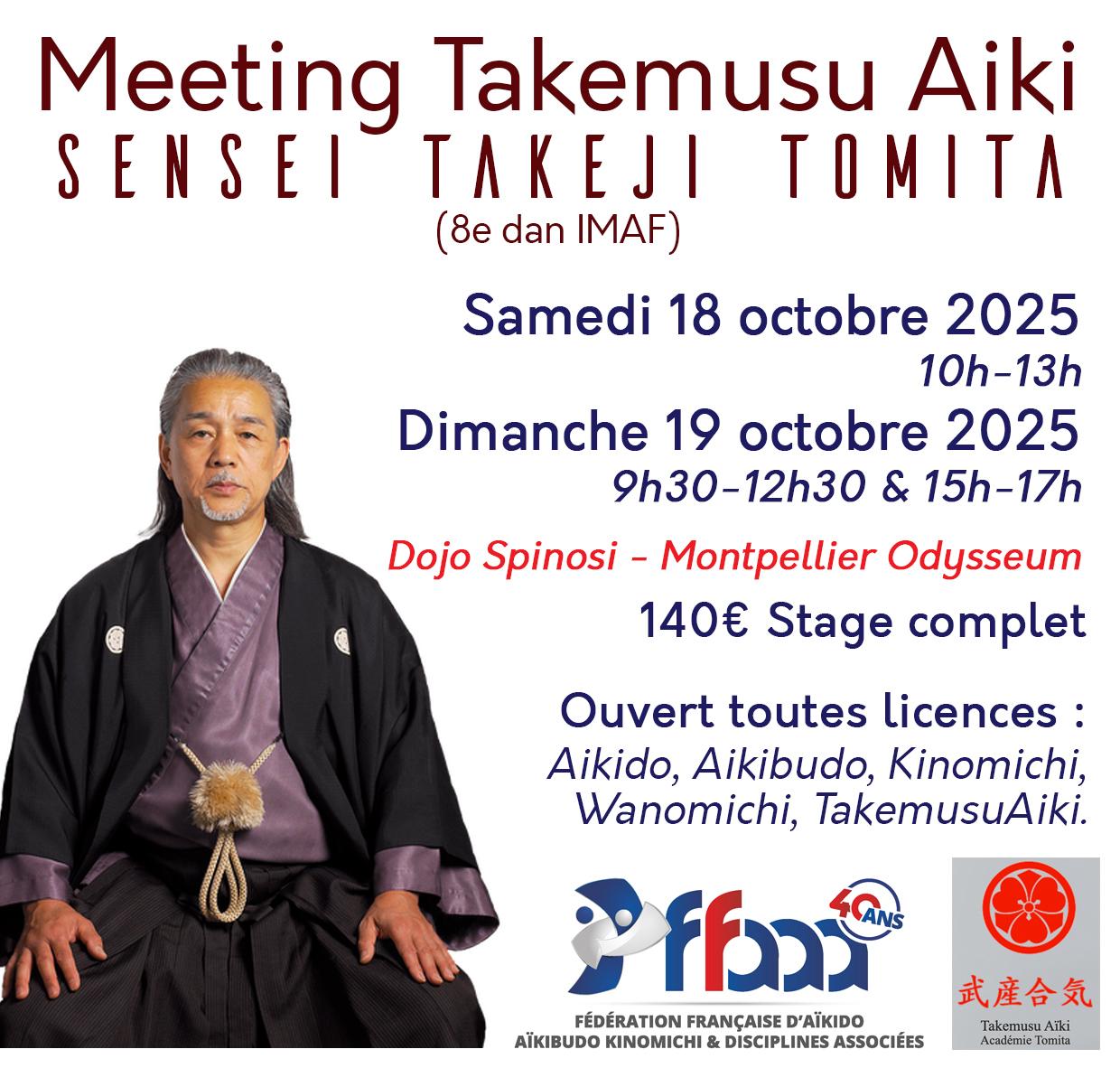 Takeji Tomita Sensei a suivi l’enseignement du fondateur O’sensei Morihei Ueshiba dès 1962, et a été le tout premier Uchi Deshi de Saito Sensei. Il a accompagné ce dernier en tant que Uke pendant plus de 7 ans dans le monde entier.